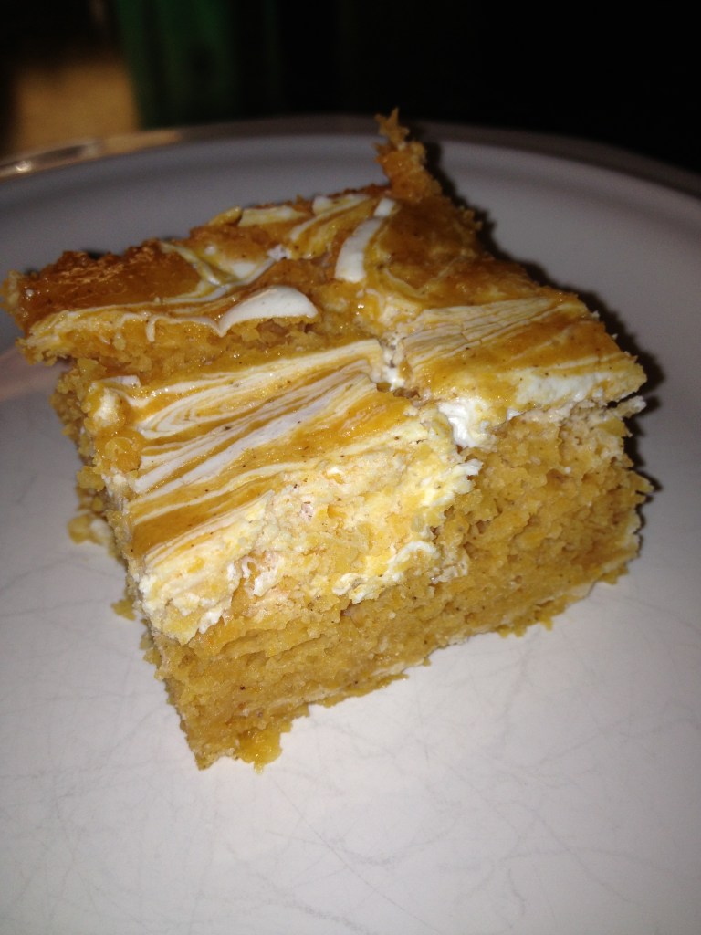 Spray a 9 x 13 Pyrex dish with Pam, and add HALF of the cake/pumpkin mix. Smooth it out with a rubber spatula. Drizzle half of the cream cheese over the top and take a small spatula to smooth it over the top. Add remaining cake/pumpkin mix and the remaining cream cheese making layers.