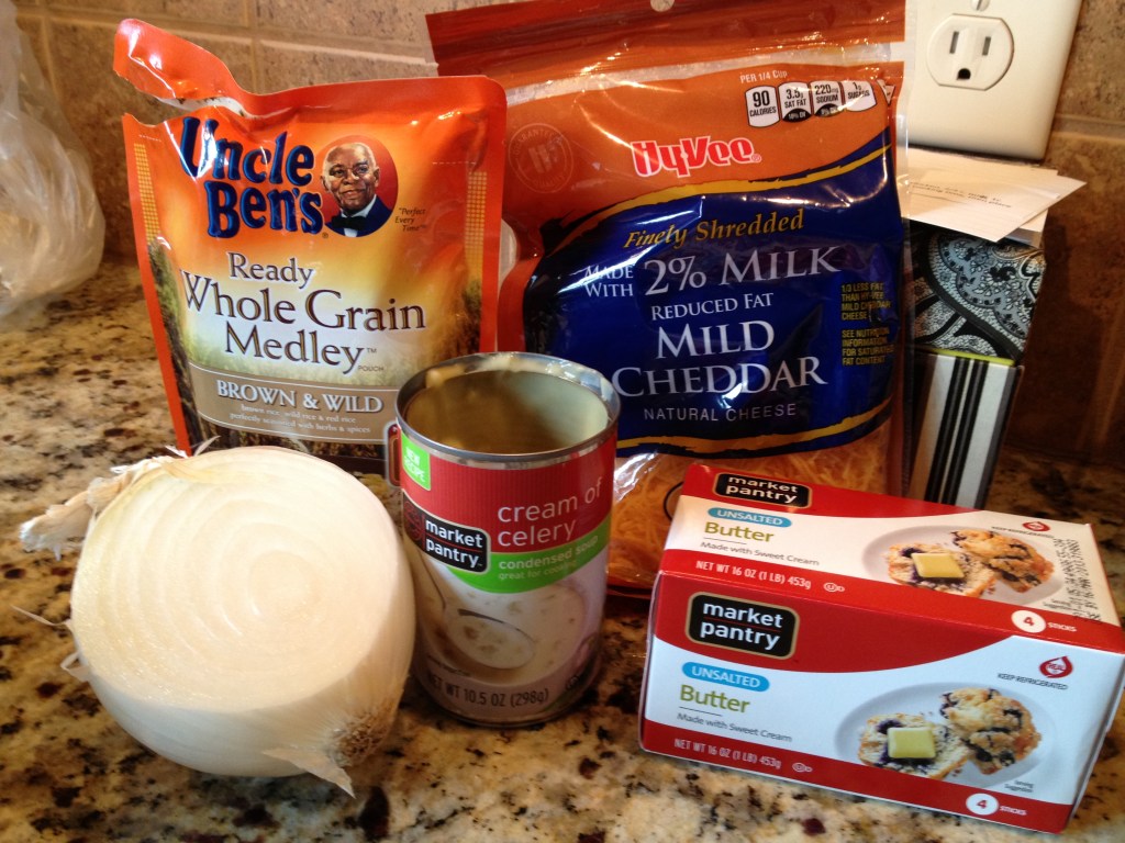Cook one box of Uncle Ben’s long grain and wild rice (I use the 90 sec bag kind – just use two bags). Mix together with one can cream of mushroom or chicken soup (I use chicken because my husband hates mushrooms!), two cups cubed chicken (I used my mom’s canned chicken, it is seriously the best invention EVER), 2/3 cup milk and 1 cup of cheddar cheese.